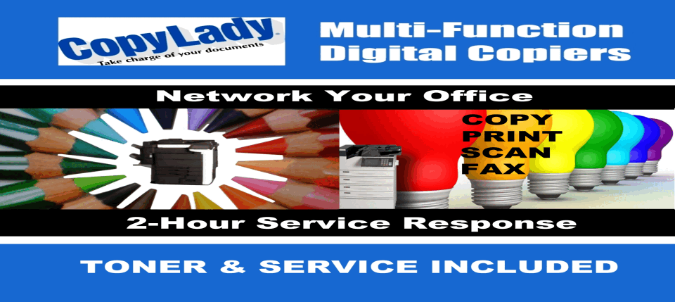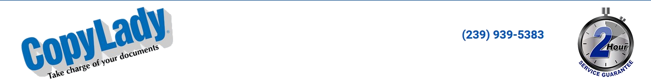 CopyLady: Proudly serving Cape Coral, Pine Island, Fort Myers and SouthWest Florida since 2002!Copier can't keep up with your ever growing needs? Call CopyLady today!At CopyLady, We carry Multifunction Printers from major brands such as Epson, Kyocera, and KIP.Got a machine you want us to fix? NO PROBLEM! We service all major printer and copier brands! We fix anything! Laser printers? YES! Inkjet printers? YES! Dot-Matrix Printers? YES! Thermal printers? YES! Al Bundy's Dodge? Can that even be fixed??Need a toner, ink or other component for an existing machine? Can't find it anywhere else? We can help you!With great equipment comes blazing fast call response times..... Hey man I ain't got time for all this paper jam nonsense! Get CopyLady here now.....WAIT! THEY'RE ALREADY HERE!With our 2-Hour Response Guarantee, you can have confidence in knowing that you will be back up and running in NO TIME!Because we at CopyLady know that you cannot afford ANY downtime, We guarantee a technician on site within 2 hours of your call! It's THAT simple! Our team of highly trained copier technicians are always ready to help when the call comes in, You can also get quick assistance fromour help desk! Do you have a question about something on your copier or printer? Need some assistance with a feature? Just give CopyLadya call, and our highly knowledgeable help desk technicians can assist you within minutes! No one can beat our response times! NO ONE!.....And the necessary supplies your machine needs to keep productivity going!Your CopyLady Service Agreement comes with the necessary toners and inks for your machine! With CopyLady's revolutionary Toner Replenishment System (TRS),You will never have to worry about being out of toner, or having to take time out of your busy day to call for toner. Once TRS tells us you are low on a toner, One of our technicians will simply deliver a fresh toner directly to your office. We carry a full selection of toners and inks in our Fort Myerswarehouse, so you NEVER have to wait for shipping! This amazing convenience is included in your CopyLady service agreement!But I gotta print something BIG! Well, We can help you print BIG!Banners? Blueprints? Posters? New wallpaper? Let CopyLady get you set up with a plotter that will let you create without limits!With sizes up to 44 inches, You can become an unstoppable force of creativity! Crisp Black & White, or colors so vibrant that it rivals real life!It's time to give your productivity the epic boost it deserves. Call 239-939-5383 NOW!Don't settle for the least, Go for the best! Like what you see? Call now or visit our site to check out our specials!Call CopyLady Today at 239-939-5383Serving Cape Coral, Pine Island, Fort Myers, and all of Southwest Florida.